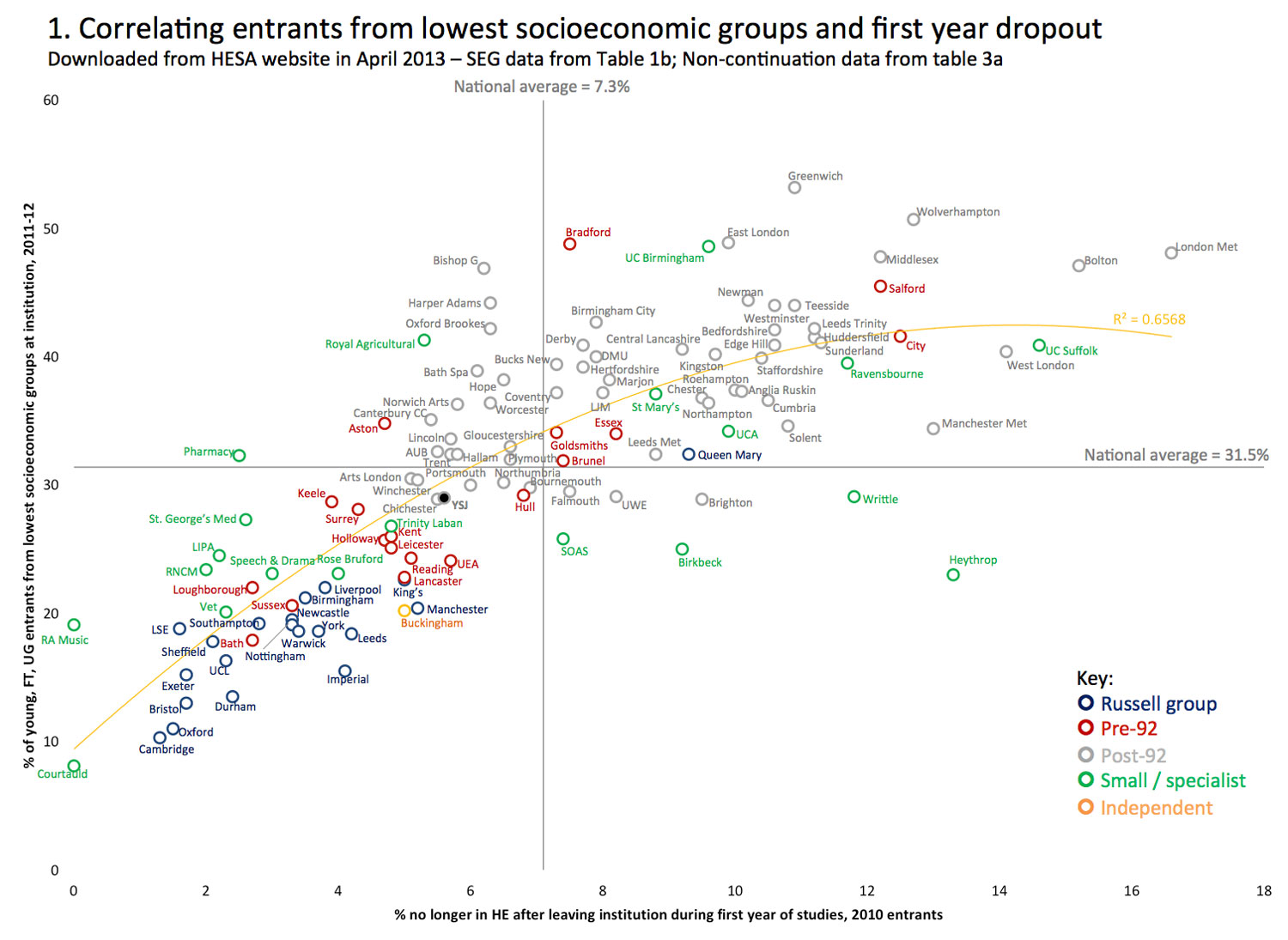 The graph below, created by York St John University, shows a clear correlation between retention at English universities and the proportion of students from a household where the highest-earning family member had a job falling into the bottom half of the National Statistics Socio-economic Classification.