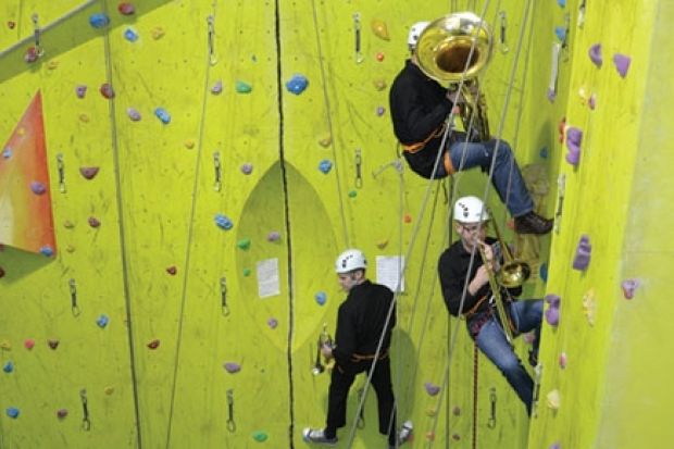 A university was the venue for an aerial concert by brass players from the Lancashire Sinfonietta. Five of the musicians donned hard hats and harnesses to scale the climbing wall at Lancaster University to play excerpts from the James Bond theme tune and Those Magnificent Men in Their Flying Machines. The event began the university's Curate the Campus project (May 1-12), which features artists staging odd projects in unusual locations. Trumpet player Helen Quayle said while none of the quintet liked heights, they had been determined to take part.