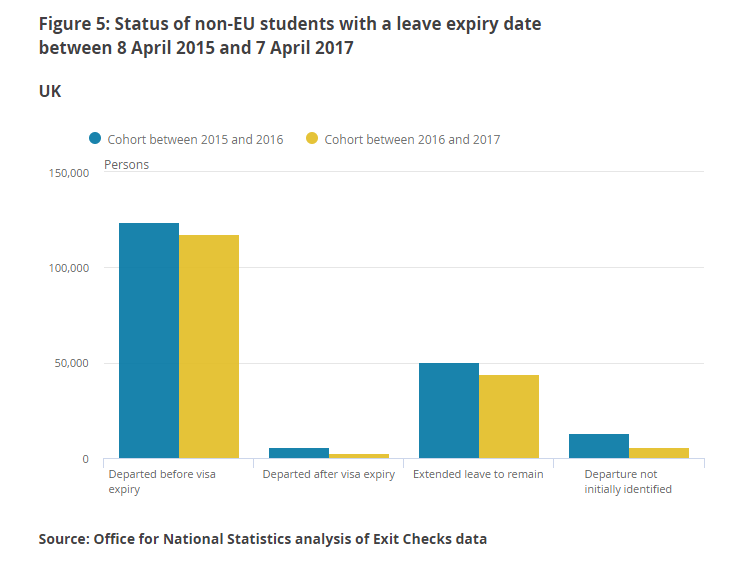 The study, from the Office for National Statistics, uses a new analysis of border checks on departing students to find that, of those whose long-term study visa expired in 2016-17, 95 per cent either left the UK or remained legally by gaining a visa extension for further study or work.