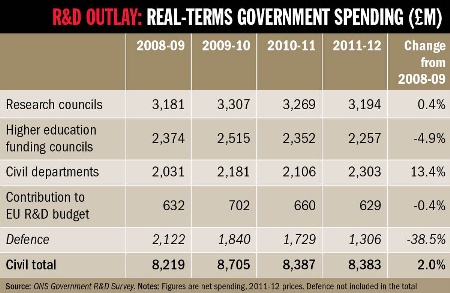 Taking into account inflation and capital spending cuts, civil spending on research and development fell by 3.7 per cent between 2009-10 and 2011-12, analysis by Times Higher Education shows (see table below).