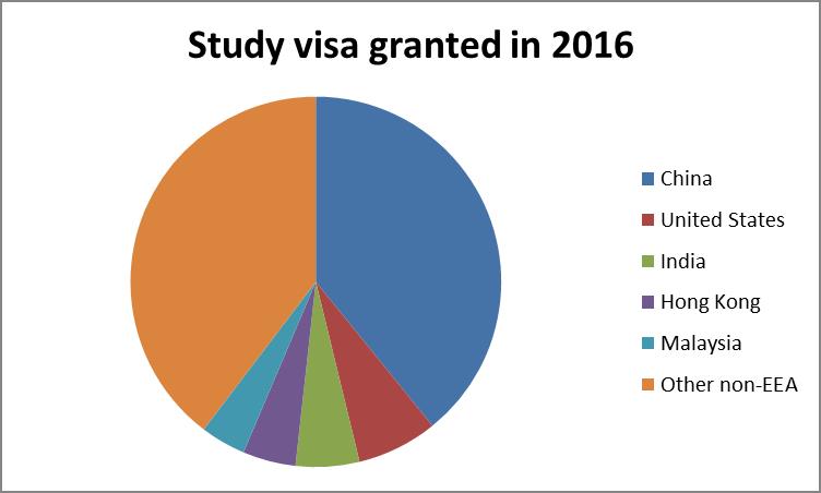 Chinese students represented almost the same proportion (39 per cent) of all main applicant study visas that were issued in 2016 as all other non-EU countries, once the US, India, Hong Kong and Malaysia are excluded (see above).