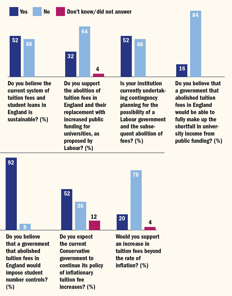 Vice-chancellors appear to regard the election of a Labour government and the abolition of fees as a real possibility, with a slim majority (52 per cent) saying that their institution was undertaking contingency planning for this scenario.
