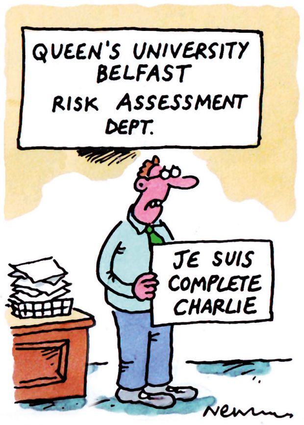 - Queen’s University Belfast has spent the week trying to disentangle itself from a row about a conference on the Charlie Hebdo murders. It emerged last week that the conference, set for June, had been cancelled owing – according to organisers – to security and reputation concerns expressed by Patrick Johnston, the vice-chancellor. Queen’s said that an appropriate risk assessment had not been completed, but, after widespread protest, announced that it would review the situation as well as issuing a statement that the university “is, and will remain, a place where difficult issues can be discussed”. The waters were further muddied when THE was told by a source that a “General Risk Assessment Form” had been completed on 23 March. Queen’s said what was lacking was “a complete risk assessment”, and one would now be carried out. Queen’s probably wishes it had carried out a complete cock-up assessment before the row erupted.