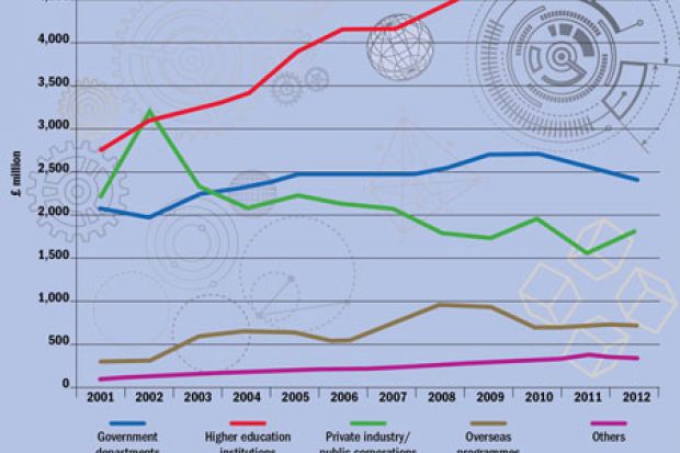 The Statistical Bulletin, published on 11 July, reports that overall net government research and development funding climbed from £6.8 billion in 2001 to a peak of £9.4 billion in 2009, before falling to about £9 billion in 2012.