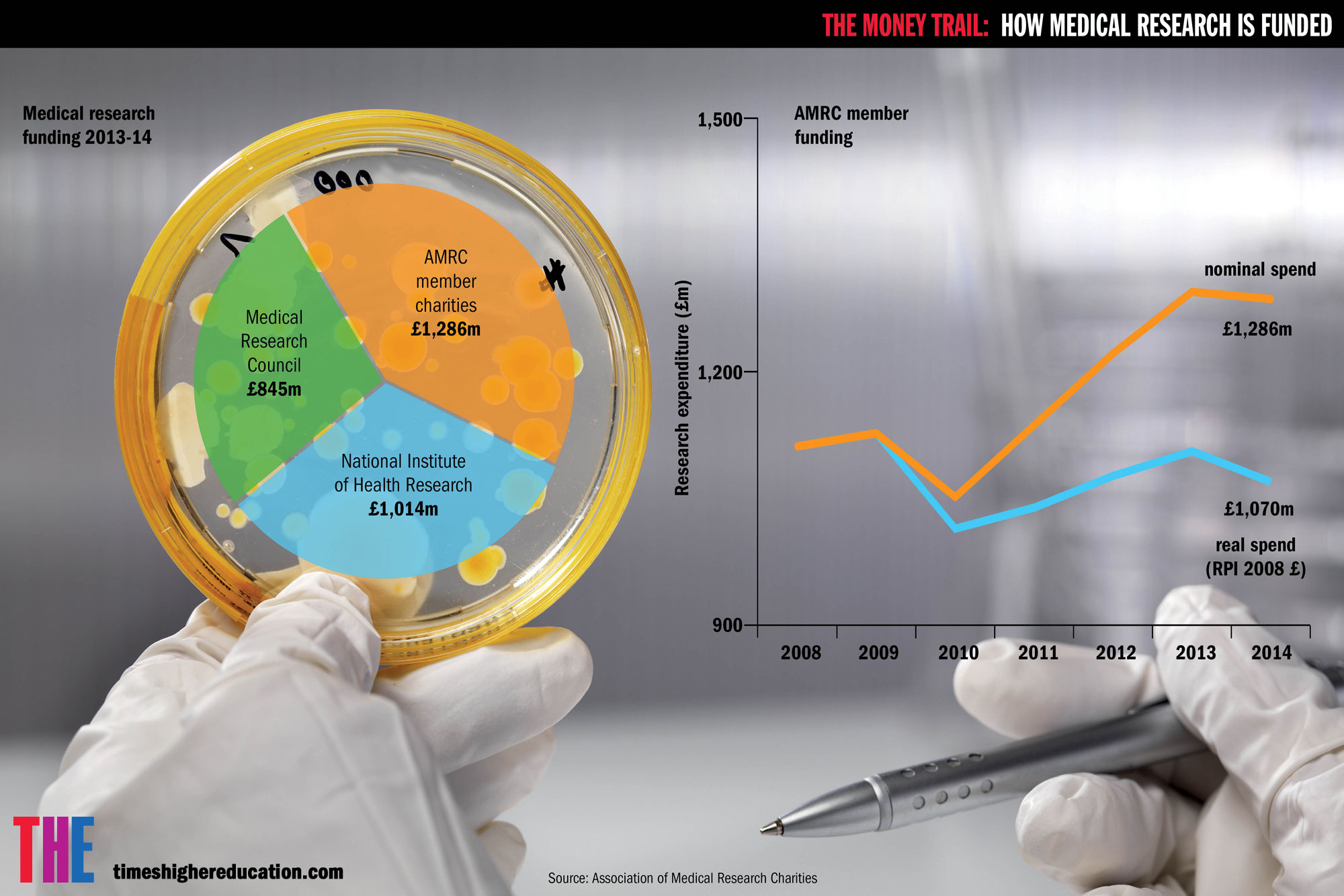 In 2013-14, charities funded more medical research than either the Medical Research Council or the NHS, according to figures released by the AMRC. But for the first time in four years charitable grants fell in 2013-14, dipping slightly to just under £1.3 billion.