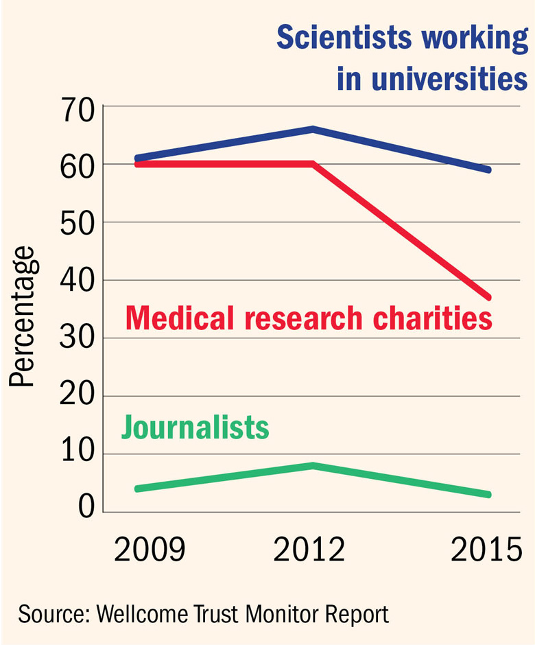 Such negative coverage appears to be filtering through into wider public perceptions of medical research charities, according to a new survey of attitudes towards science released last week, eroding confidence in bodies that provide universities with huge amounts of money and drive the direction of new research.
