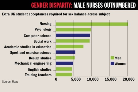 In all types of engineering, it would take just over 15,000 extra female students to balance out the current male dominance of the subject, she said. But in subjects allied to medicine, which includes nursing, the number of extra men needed was close to 30,000, she said.