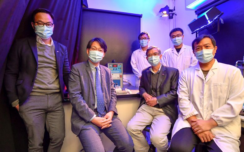 Members of the CityU research team: (from left in front row) Dr Steven Wang, Professor Wang, Professor Pan Chin, Dr Jiang Mengnan; (from left in back row) Mr Liu and Mr Li.