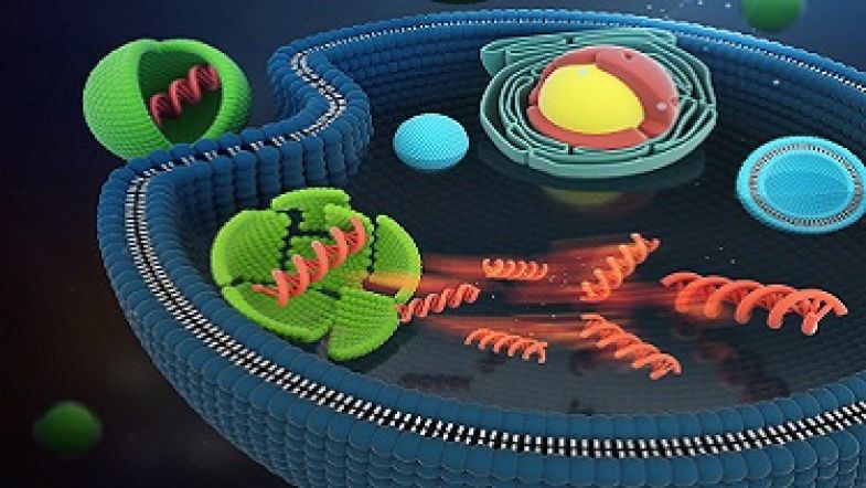 DNA being delivered into the nucleus of a stem cell - An artistic rendition of the study led by Dr Gang Ruan and selected as a supplementary cover art by the journal Nano Letters. Credit: American Chemical Society (Nano Letters)