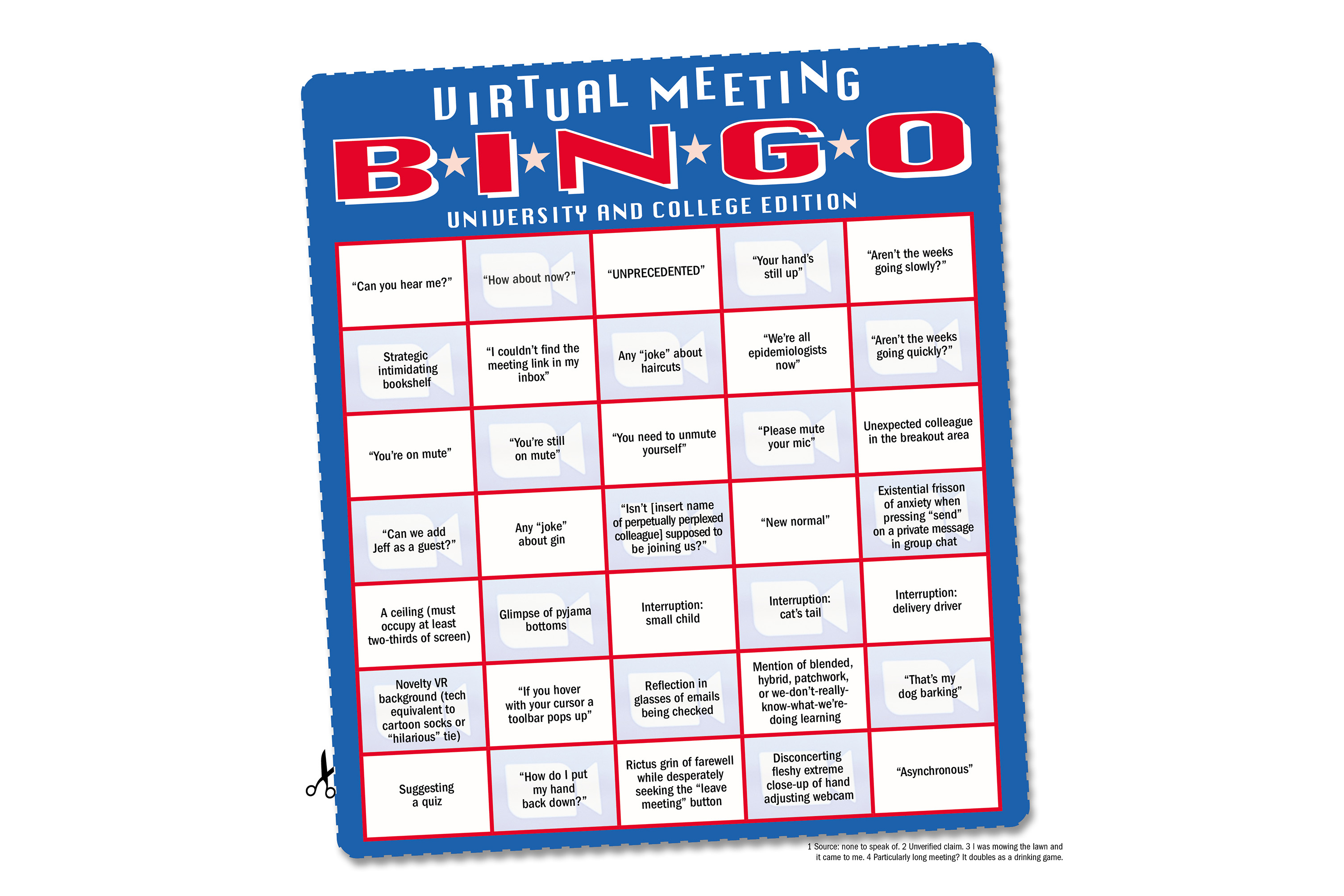 University staff have, since lockdown began, attended on average 64.1 per cent more meetings1 than over the same period last year. Whether on Zoom or on Microsoft Teams, these meetings cover a range of topics, but every single one of them2 features at least one of the entries on this handy, cut-out-and-keep bingo card. Our spotter’s compendium has been scientifically3 designed to keep your spirits up4 through any remaining exam boards or planning meetings, right through to the start of the next academic year.