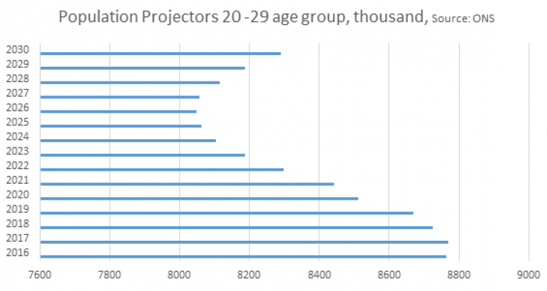 The declining number of 18-year-olds in the UK will, over the coming years, translate into shrinking numbers of 19-, 20- and 21-year-olds. The number of 15- to 19-year-olds will begin to rise again around 2020, but the cohort of 20- to 24-year-olds will not bottom out until 2026, while 25- to 29-year-olds will take until 2030. This means that between now and 2026, we will see a progressive decline in the total number of students between the ages of 20 and 29.