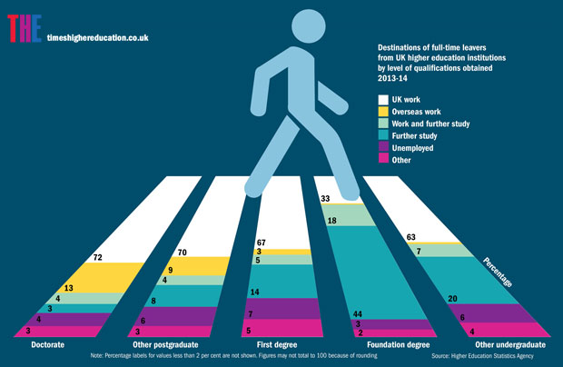 About 13 per cent of all doctoral graduates in 2013-14 went to work overseas within six months of graduating, compared with just 3 per cent of first-degree holders and 9 per cent of those with other postgraduate degrees, according to the Destinations of Leavers from Higher Education in the United Kingdom survey. Less than 2 per cent of foundation degree or other undergraduate qualification holders end up working abroad. But foundation degree holders were the least likely to be unemployed. By contrast, 4 per cent of doctoral graduates, 6 per cent of other postgrad awardees and 7 per cent of first-degree holders remained unemployed six months after graduating.