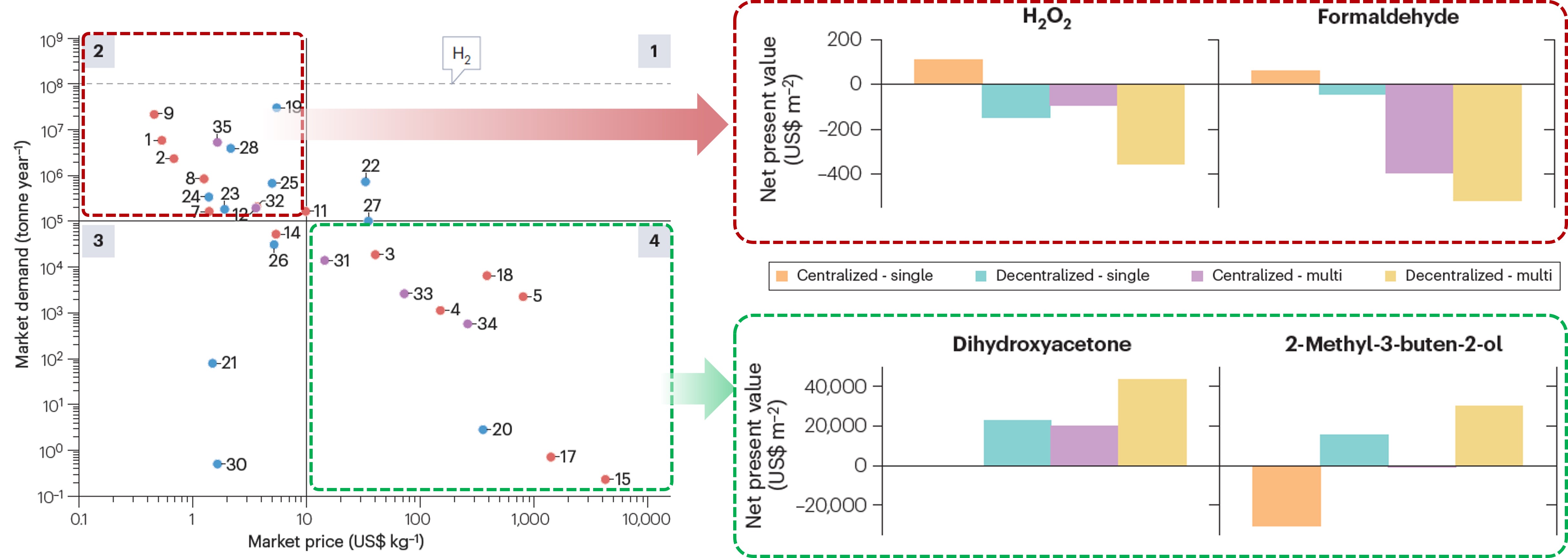 Chemicals proposed for solar-driven electrolysis are identified by their market demand and market price. They can be divided into four quadrants. Depending on their quadrant, different implementation strategies are expected: quadrant 2 chemicals (e.g., formaldehyde) favour centralised, single-product facilities, while decentralised, multi-product plants are better for quadrant 4 chemicals (e.g., dihydroxyacetone).