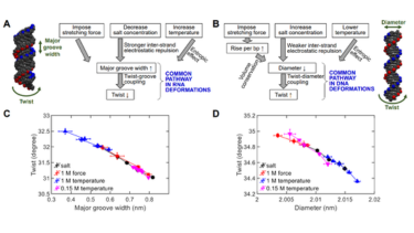 Professor Dai’s team found that DNA deformations are usually driven by twist-diameter coupling, i.e., the strong coupling between DNA twist and diameter, and RNA deformations are usually driven by twist-groove coupling, i.e., the strong coupling between RNA twist and major groove width. The team quantified both the twist-diameter coupling constant and RNA twist-groove coupling constant, and applied the coupling constants to explain DNA and RNA deformations.