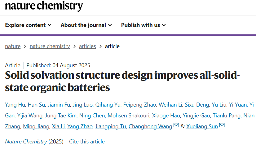 On August 4th, the team led by Professor Xueliang Sun published their work titled "Solid solvation structure design improves all-solid-state organic batteries" in Nature Chemistry. This study reports the use of an n-type organic small molecule cathode material as a solid solvent, introducing dual ions to construct a heteronuclear solid solvation structure. This approach activates a ligand-metal-ligand-charge transfer channel, achieving a high operating voltage of 3.6 V, an ultra-long cycle life exceeding 7500 cycles, and excellent rate capability. This work introduces the concept of the solid solvation structure, establishing a synergistic regulation theory connecting molecular structure, electronic structure, and electrochemical performance. It offers a new pathway for all-solid-state batteries characterized by sustainability, high performance, and low cost.