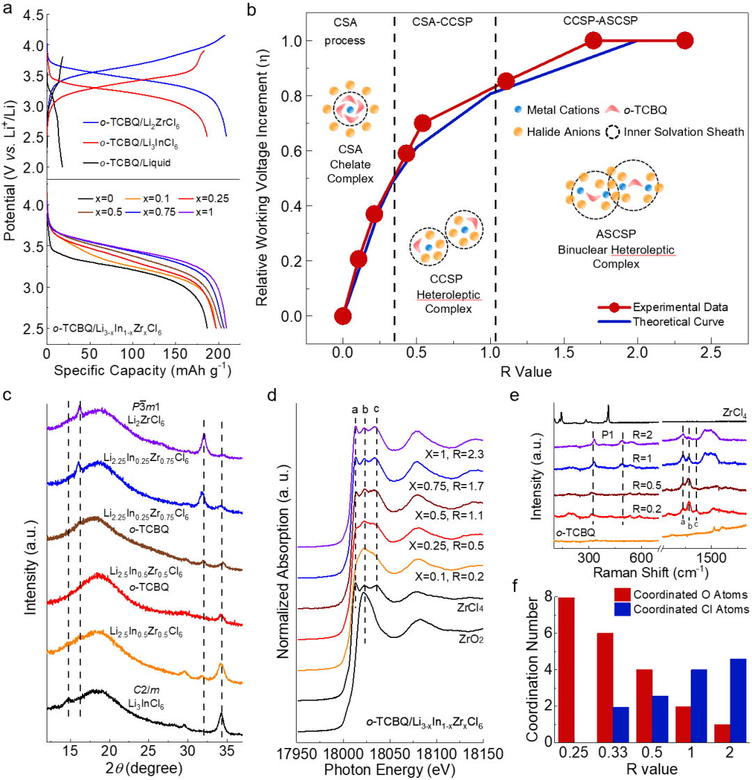 The study found that as ions like Zr⁴⁺ gradually entered the organic phase, forming multi-center coordination with the C=O groups of o-TCBQ, it not only induced electron delocalization towards the inorganic Cl ligands but also significantly enhanced the molecular voltage and redox activity. Further introduction of Nb⁵⁺ and Al³⁺ to construct a heteronuclear, heteroleptic ASCSP structure activated a ligand-metal-ligand charge transfer mechanism. This breakthrough overcame the limitations of interrupted reduction and voltage hysteresis typical of conventional organic electrodes, achieving a high operating voltage of 3.6 V in the all-solid-state system, a significantly reduced voltage hysteresis (700 → 180 mV), and enhanced reversibility of the two-electron reaction (Fig. 2). Benefiting from the optimized solvation structure and the novel electron transfer mechanism, this solid cathode solution system not only possesses high voltage and fast kinetics but also exhibits exceptional long-cycle performance and rate capability even under low stack pressure. Importantly, owing to the low Young's modulus of o-TCBQ and the electrostatic interactions with the halide electrolyte, the material can adaptively embed into the electrolyte grain boundaries during charge/discharge processes, achieving crack repair and enhanced electrical contact, demonstrating self-healing interfacial characteristics.