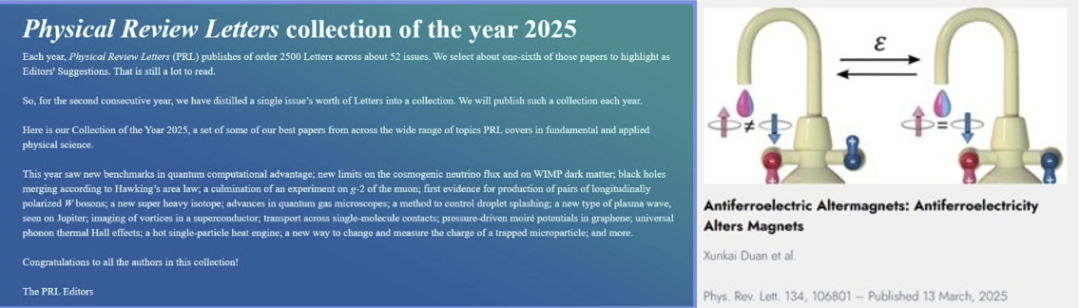 Recently, Physical Review Letters (PRL), one of the world's premier physics journals, officially announced its collection of the year 2025. The original research achievement on antiferroelectric altermagnets by the team of Associate Professor Tong Zhou from the Eastern Institute of Technology, Ningbo (EIT), has been selected.