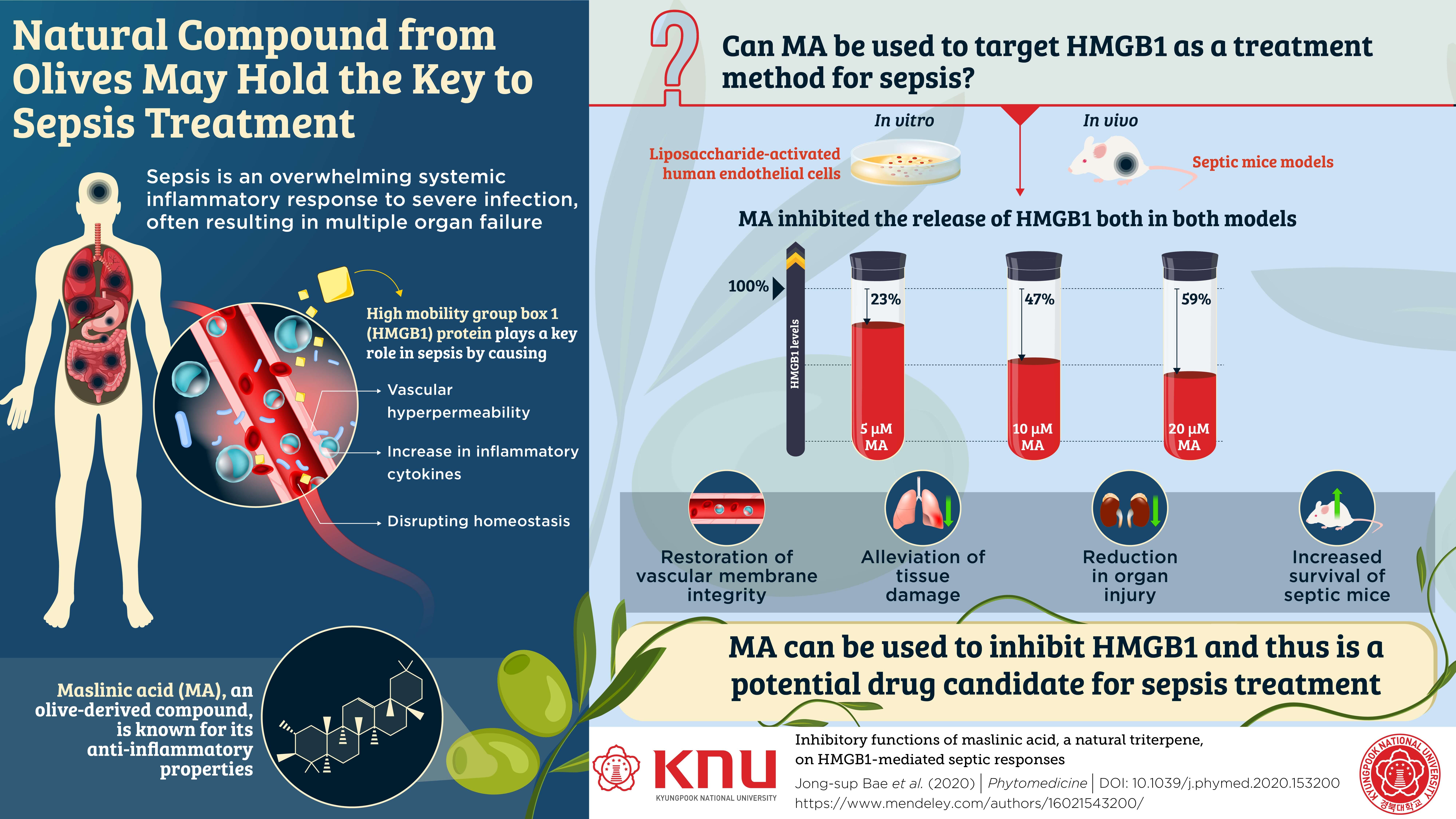 To this end, the scientists first identified a compound derived from olives, called maslinic acid (MA). MA is known to have a variety of beneficial health properties, but the scientists were curious to check its effects on HMGB1 owing to its anti-inflammatory properties. Prof Bae says, “Over the past few decades, our team has been working to look for novel small molecules or proteins that could be used as drugs for the treatment of sepsis, which is a life-threatening condition.”
