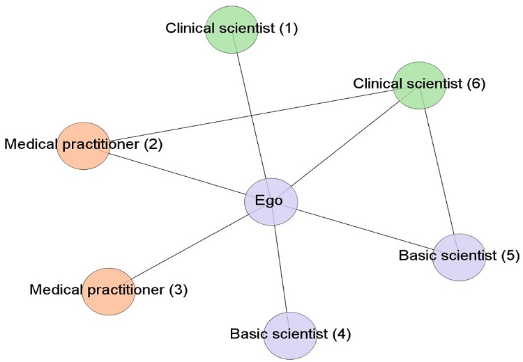 This Figure depicts the network of a basic scientist (the “ego”) and shows that an actor can occupy multiple brokerage roles. The total number of brokerage roles held by this scientist is 13, distributed as: Nº of coordinator roles = 1 (4-5); Nº of gatekeeper roles = 7 (1-4, 1-5, 2-4, 2-5, 3-4, 3-5, 4-6); Nº of consultant roles = 2 (1-6, 2-3); Nº of liaison roles = 3 (1-2, 1-3, 3-6). In the ‘coordinator’ role, all three actors belong to the same professional community; ‘gatekeeper’ corresponds to an open triad where the alters belong to different professional communities, one of which is the same as that of the ego; ‘consultant’ includes alters from the same professional community, which is different from that of the ego; and ‘liaison’, which is the most heterogeneous open triad, is where all three actors belong to different professional communities.
