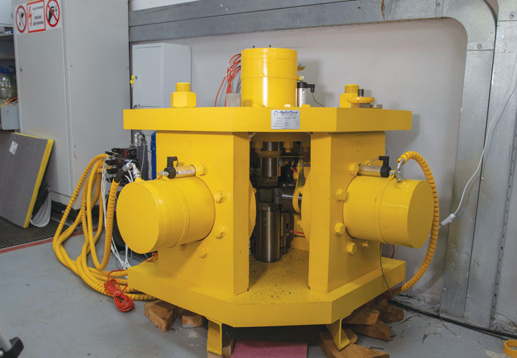 “The uniqueness of the machine is that the investigated core fragment is loaded independently from three sides. To do this, in the inner block we designed a rather complex kinematics of a decreasing cube with 100 per cent overlap of the edges,” explains Podyachev. “As a rule, a cylinder with a diameter of 30 millimetres and a height of 30 or 60 millimetres is considered the reference shape of the core being examined. However, it is impossible to provide a fully fledged orthogonal load along three axes on such a sample.