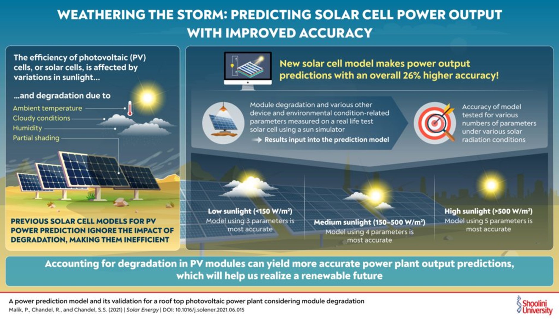 Scientists from Shoolini University, India, in collaboration with the National Institute of Technology, Hamirpur, India, have developed a new mathematical model to predict the solar cell output power in all weather. By taking into account the degradation of the photovoltaic modules over time (as well as other external factors), this model is more accurate than existing ones. It will help produce precise power generation forecasts, facilitating the implementation of solar power systems and easing the transition towards renewable energy sources.