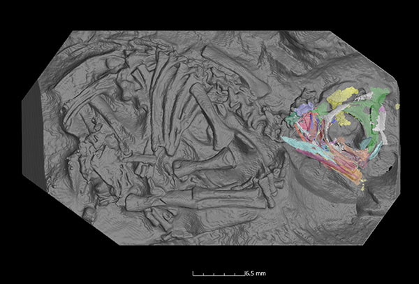 At the ESRF, a massive ring of electrons traveling at the speed of light emits high-powered X-ray beams that can be used to CT scan objects like fossils. The embryos were scanned at an unprecedented level of detail – at the resolution of an individual bone cell. With these data in hand, and nearly 3 years of data processing at Wits’ laboratory, Chapelle was able to reconstruct a 3D model of the baby dinosaur skull.