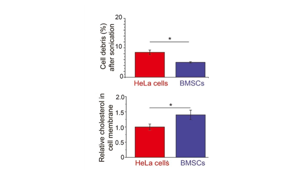 Bone marrow-derived mesenchymal stem cells (BMSCs) were less damaged after sonication than other cell types (top), measured by flow cytometry. BMSCs also had more cholesterol in their cell membranes (bottom). This could be why it is more difficult to penetrate stem cells