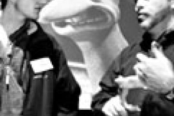 Will Byles, right , head of computer-generated imagery at Aardman Animation, explains techniques used in the creation of the film Chicken Run to students after his lecture organised by Swansea...