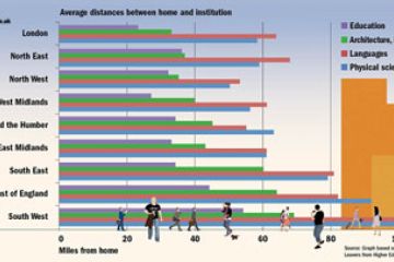 Physical sciences students from southwest England travel almost five times further to study than those originally from London who read education, according to data highlighted by the Higher Education...