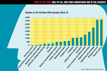 Almost half of all students starting PhDs are working in the physical sciences, the biological sciences or engineering and technology fields