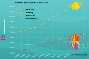 Different types of university across UK higher education have seen varying fortunes when it comes to international student recruitment over the past 10 years, this graph shows