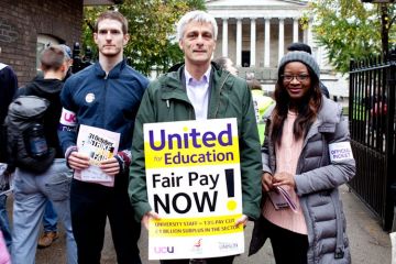 Noisy protests on pickets lines, cancelled classes and student occupations have been seen at universities across the country as trade unions mounted a one-day strike over pay.