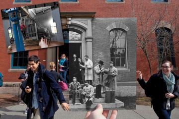 A Brown University chemistry class from the 1870s poses for a photograph on the steps of Rogers Hall (now the Salomon Center) as a professor, John Appleton, appears to watch current students leaving...