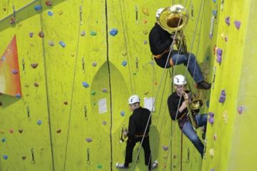 A university was the venue for an aerial concert by brass players from the Lancashire Sinfonietta. Five of the musicians donned hard hats and harnesses to scale the climbing wall at Lancaster...