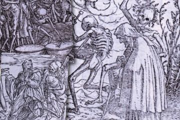 In the gruesome or grimly comic medieval Dance of Death, skeletons or decaying corpses are depicted rounding up the living.