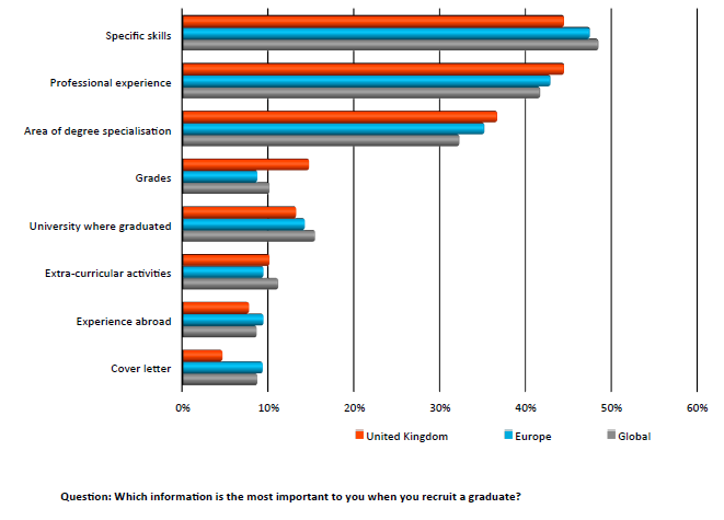 UK employers put more of an emphasis on grades, professional experience and degree subject than employers in Europe or multinational recruiters worldwide.