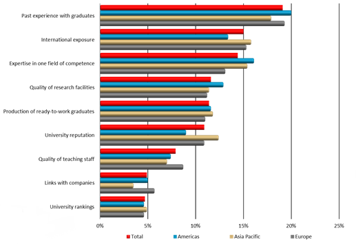 Nonetheless, the survey reveals that many recruiters do form preferences for certain universities, largely based on their past experience with graduates, the international exposure graduates could have had at university, and the level of expertise that they assume graduates will have.