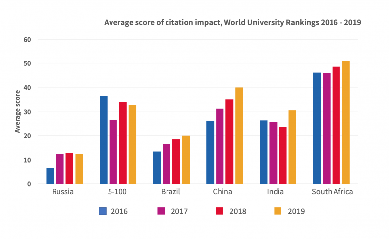 As the following graph - showing the average citation impact scores from 2016 to 2019 for 5-100 universities compared with various nations (including Russia as a whole) – shows, it is not always a given that there will be immediate improvements in the research impact of institutions sponsored in this way.