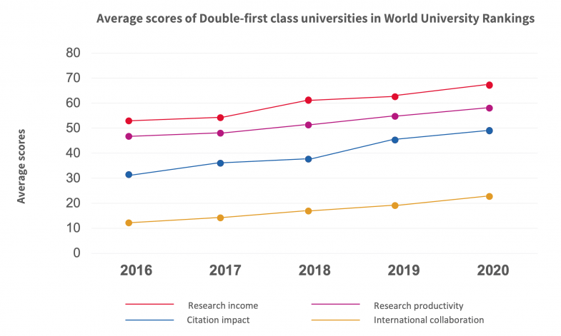 An analysis of data for Double First Class universities that have appeared in each of the last five iterations of the THE World University Rankings shows that they have made steady progress over that time in four key areas: research income, research productivity, the citation impact of scholarly papers and international research collaboration.