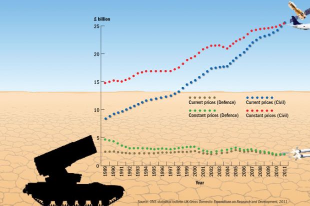 Spending on defence research and development in the UK has declined by 57 per cent since 1989, data from the Office for National Statistics show.