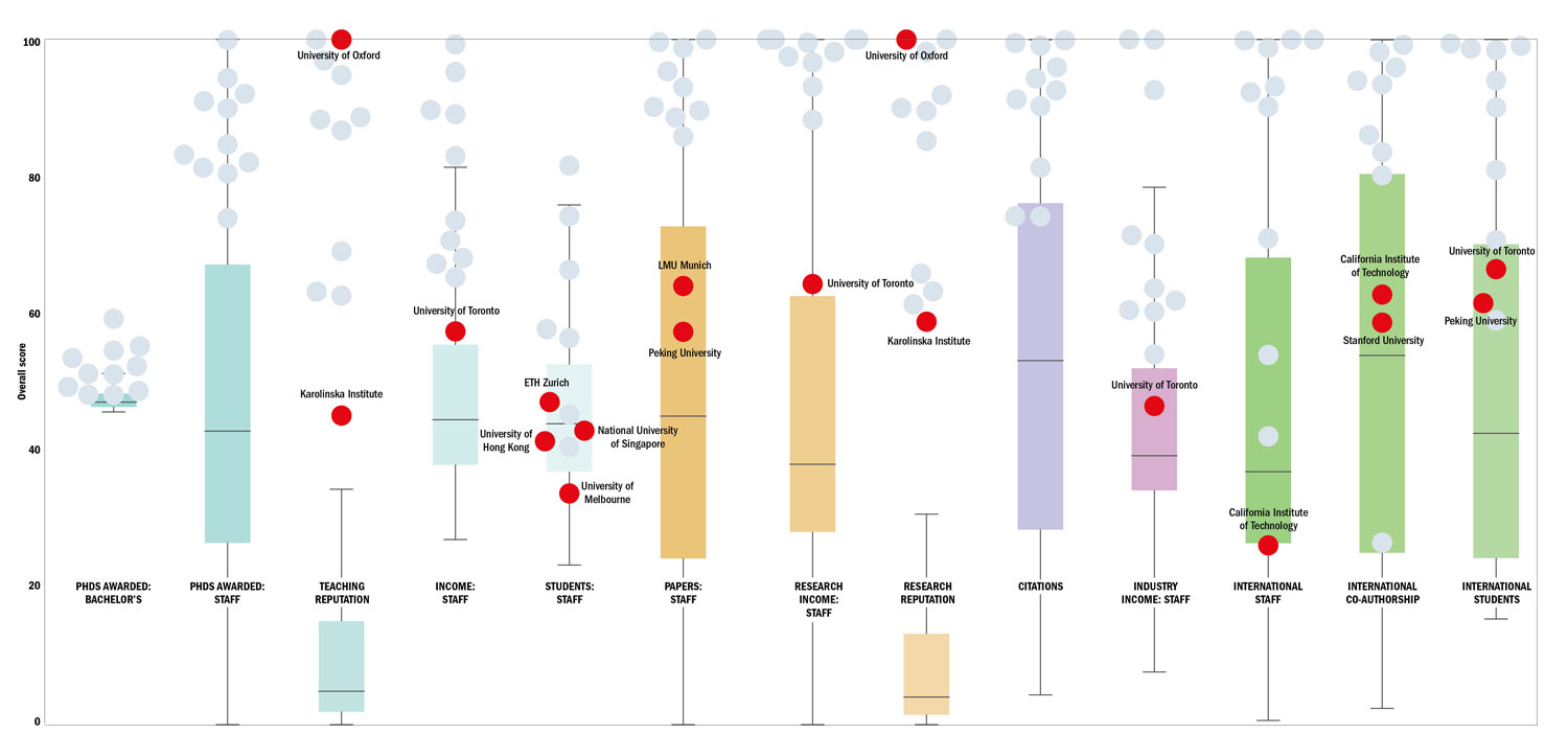 But there are other individual metrics with an interesting spread of scores. These include staff-to-student ratio, where the University of Melbourne comes in under the lower quartile, and five others (including ETH Zurich – Swiss Federal Institute of Technology Zurich, the National University of Singapore and the University of Hong Kong) are bunched around the median. The measure of papers per academic staff is also interesting, with Peking and LMU Munich scoring above the median but not as well as other members of the elite.