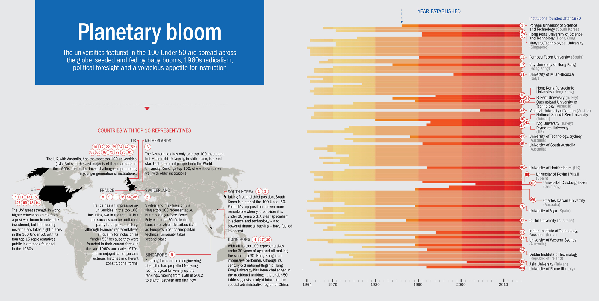 The universities featured in the 100 Under 50 are spread across the globe, seeded and fed by baby booms, 1960s radicalism, political foresight and a voracious appetite for instruction.