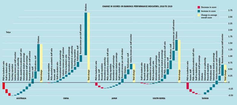 South Korea has a more positive picture: there is evidence that a batch of universities are improving on citation impact, while some that already scored well appear to be gaining on reputation, too.
