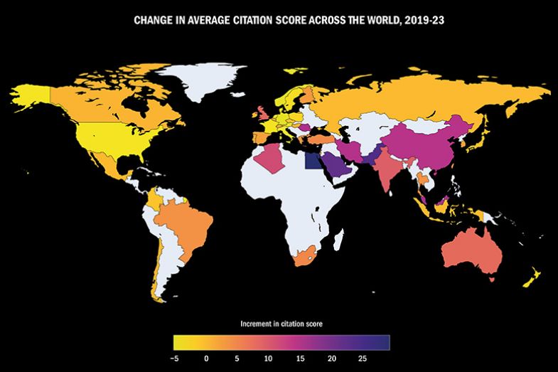 As the map below shows, citation scores (based on countries with at least five universities continuously ranked since 2019) on the continent are growing at a faster pace than the rest of the world.