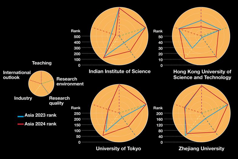 This year, there have been some shifts in the ranks of established universities across Asia. These radar charts, showing the 2024 and 2023 pillar ranks for four institutions, reveal what is driving the changes.
