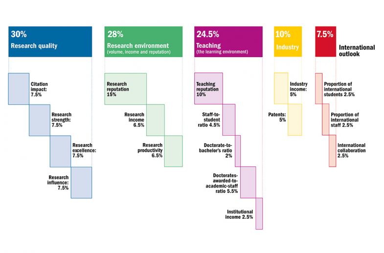The performance indicators are grouped into five areas: Teaching (the learning environment); Research environment (volume, income and reputation); Research quality (citation impact, research strength, research excellence and research influence); International outlook (staff, students and research); and Industry (income and patents).