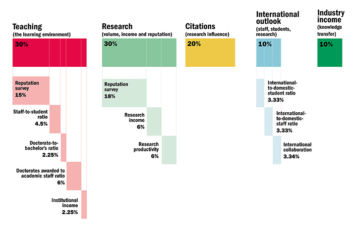 Institutions provide and sign off their institutional data for use in the rankings. On the rare occasions when a particular data point is not provided – which affects only low-weighted indicators such as industrial income – we enter a low estimate between the average value of the indicators and the lowest value reported: the 25th percentile of the other indicators. By doing this, we avoid penalising an institution too harshly with a “zero” value for data that it overlooks or does not provide, but we do not reward it for withholding them.