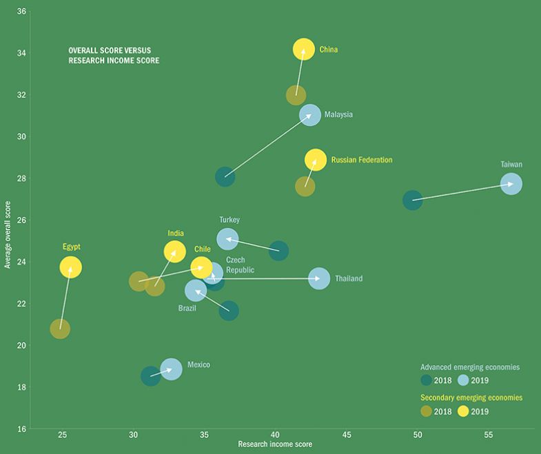 However, most other nations in the set improved both their research income score and their overall rankings result, most obviously Malaysia. China and Russia did not record a large increase in their average research income score, but both consolidated their place as the leading emerging countries in the ranking overall, alongside Malaysia and -Taiwan.