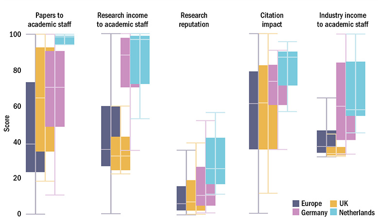 The boxes and “whiskers” show where the bulk of the universities in each country sit in terms of scores on each measure (compared with the distribution of all Europe’s ranked universities).