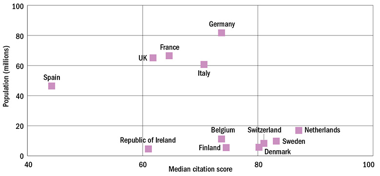 As well as the smaller research powerhouses already mentioned, the Republic of Ireland is in many respects a standout performer: despite its very small population, its median score is very close to that of much larger countries such as the UK and France.